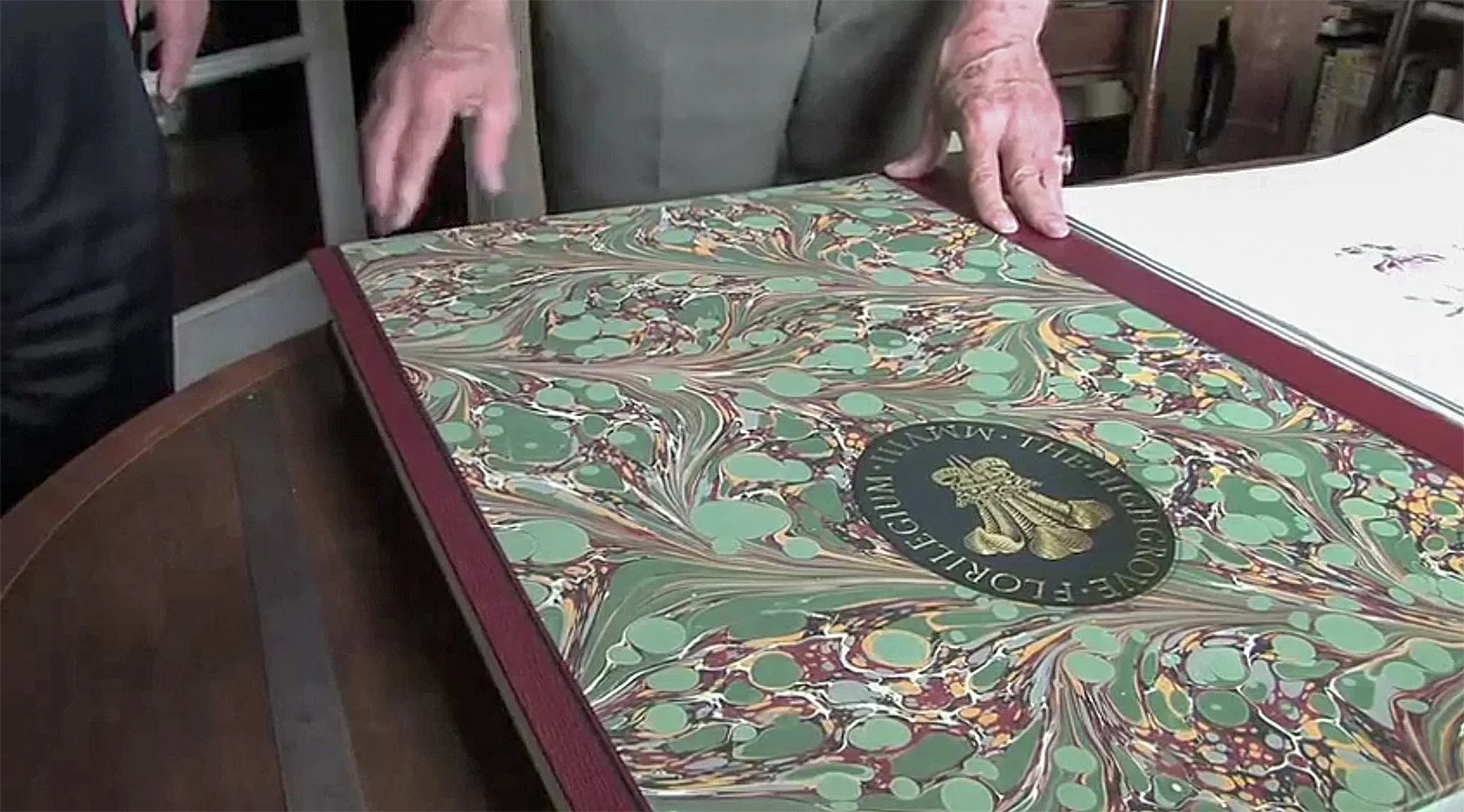 The paper sides of the Highgrove Florilegium are hand-marbled.