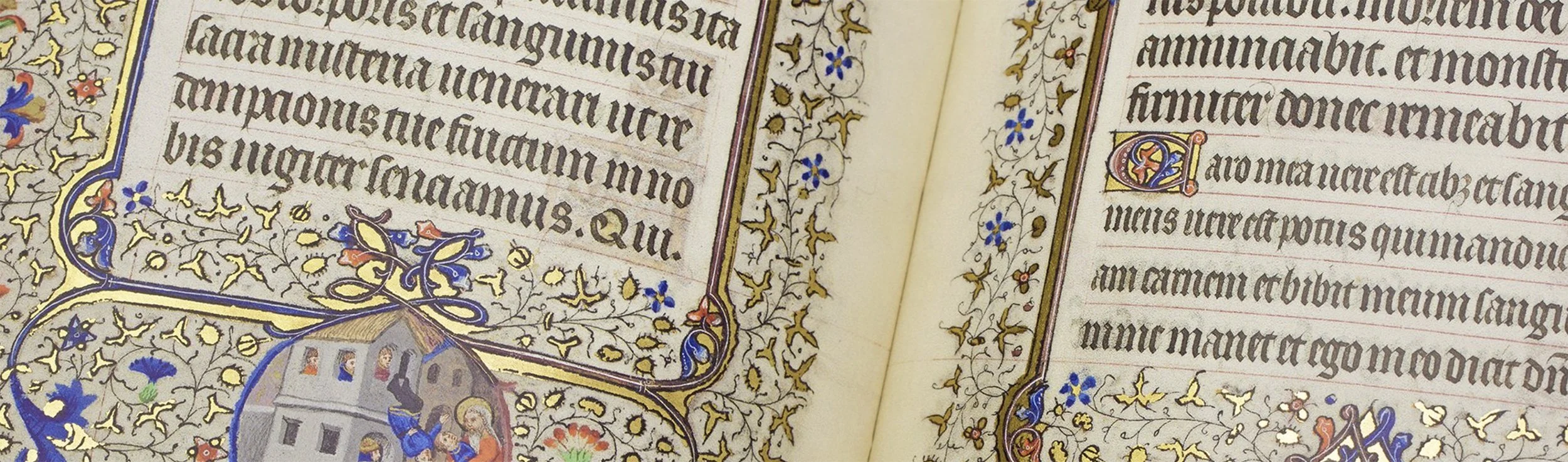The Bedford Book of Hours is an unusually extensive painted manuscript; every single page is illustrated. There is splendid scrollwork, with hundreds of tiny golden vine or acanthus leaves, colourful flowers and small animals covering the pages. The miniatures are decorated with gold leaf, brush gold and sometimes silver. The Latin text is embellished with numerous gold initials and imaginative line-fillers, while French explanations of the miniatures appear in red, blue, and gold writing at the bottom of each page