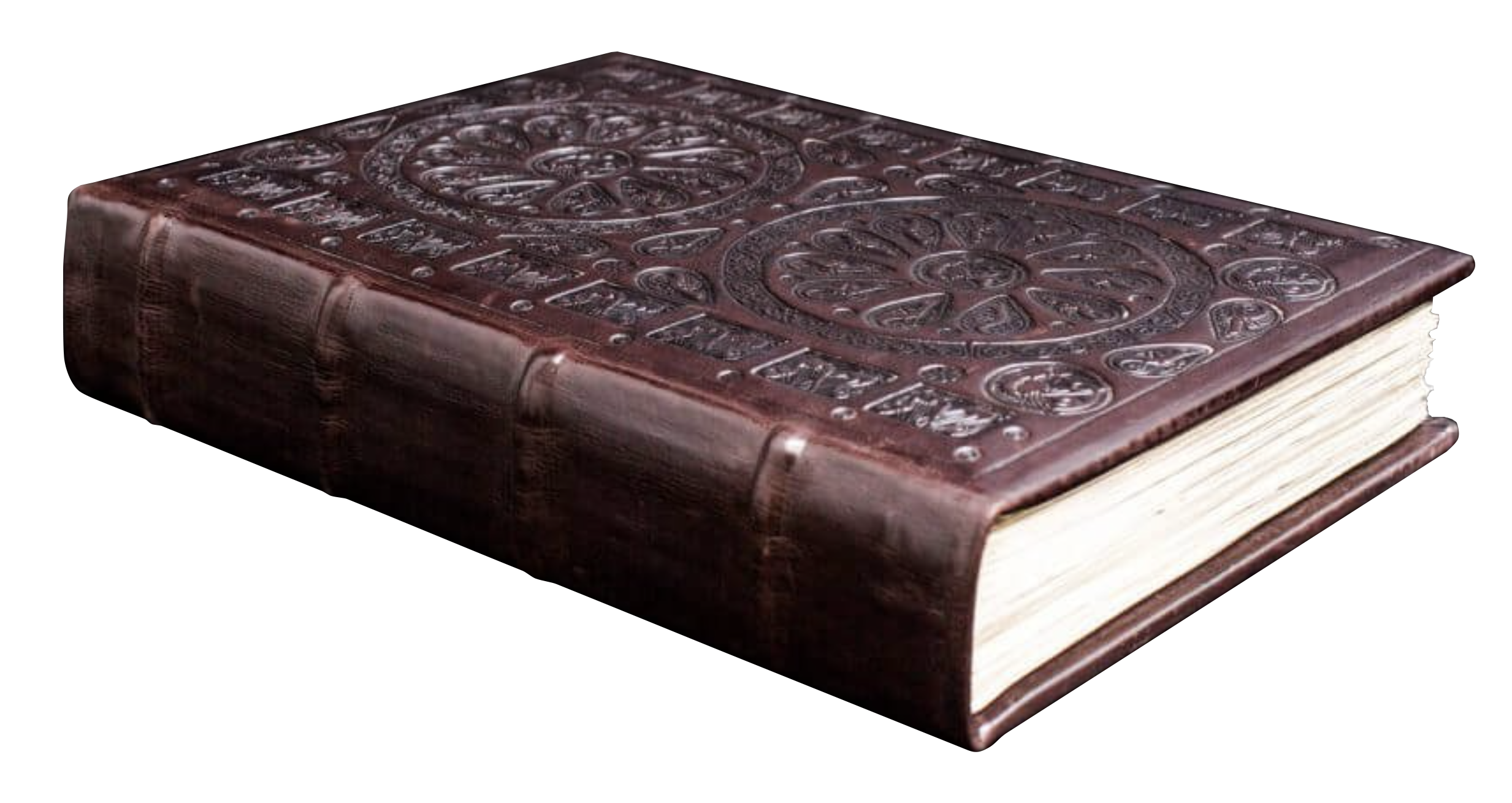 The two-volume facsimile of Great Domesday made by Alecto Historical Editions, is bound in brown embossed calfskin to the 12th Century design of the Winton Domesday (which is one of only thirteen known English Romanesque bindings that have survived).